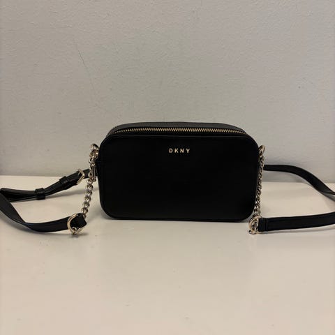 DKNY axelremsväska i svart tyg med ton-i-ton-logomönster. Väskan har justerbar axelrem, dragkedja upptill och ett yttre fack framtill. Invändigt finns fodrat huvudfack med mindre fack.