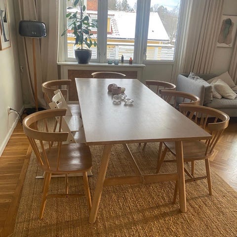 Har behandlats nyligen och fått en något mer ek färg. Viss slitage finns men det syns knappt.