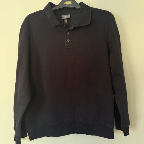 Mörkblå sweatshirt med ribbade muddar och en stilren design. Tröjan har en V-detalj vid halsen och en subtil textur på framsidan.