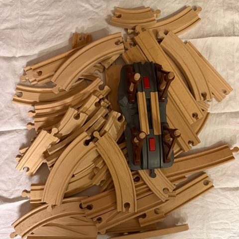 BRIO trätågbana med räls och tåg. Setet innehåller flera raka och kurvade träskensdelar, växlar och olika specialdelar samt flera mindre trätåg och vagnar i olika färger. Delarna är kompatibla med BRIOs klassiska trätågssystem och kan byggas ihop till olika banor. Passar för barn som gillar att bygga och leka med tågbanor inomhus.
