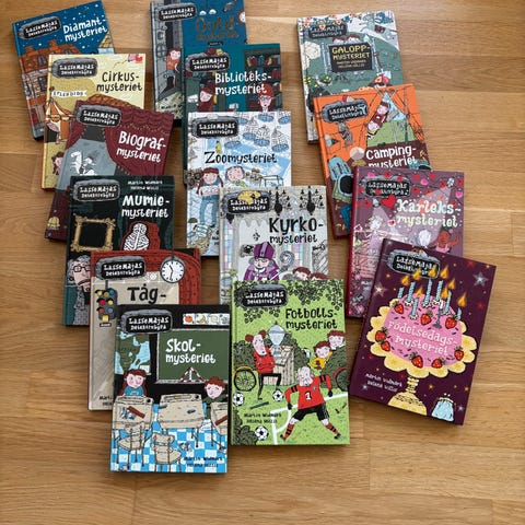 LasseMajas detektivbyrå bokpaket med flera titlar ur serien för barn. Inbundna böcker med färgillustrerade omslag. Passar som högläsning eller egen läsning för barn i låg- och mellanstadieålder. Paketet innehåller olika fristående mysterier med återkommande huvudpersoner i den fiktiva staden Valleby.