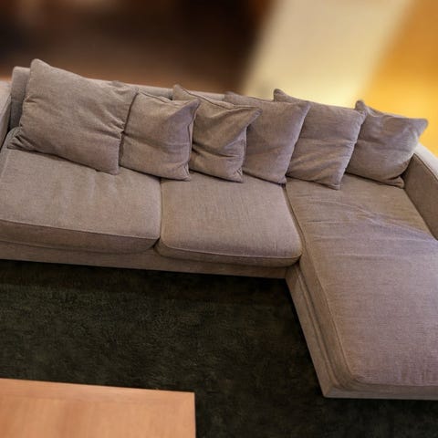 Soffan är välanvänd men i bra skick. Dynorna är något nedsuttna men fortfarande bekväma då den delvis är fjäderstoppad. Alla överdrag är avtagbara och går att tvätta, vilket gör den enkel att fräscha upp.