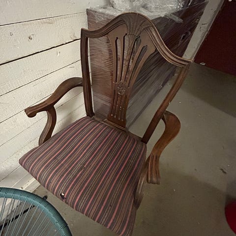 Renoverad gammal karmstol i ek. Sitthöjd 50 cm.