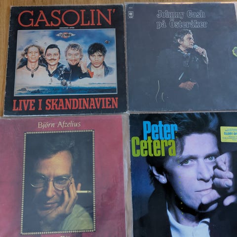 Paket med flera vinylskivor i LP-format från blandade artister. Omslagen visar olika album med både soloartister och samlingsskivor.