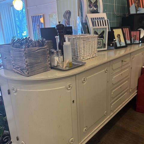 Jättefin gammal skänk/skåp. Skåpet är målat vitt utvändigt och har grön insida. Överst finns flera mindre lådo, och nedtill två dörrar som döljer ett större förvaringsutrymme med hylla. Möbeln lämpar sig för förvaring i exempelvis vardagsrum, hall eller matsal.