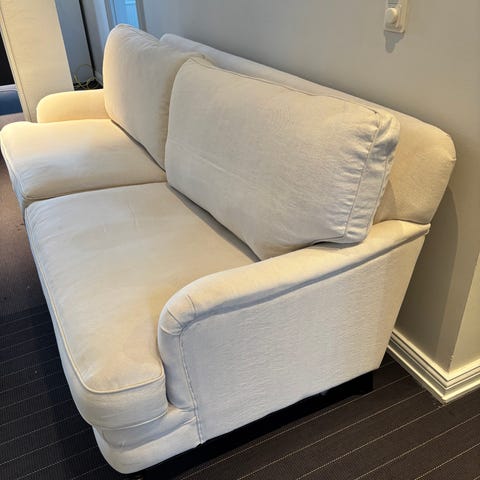 Säljer en 6 år gammal soffa som är använd men i bra skick. Soffan är bekväm och stoppad med dun för extra mjuk komfort. Klädseln är avtagbar och kan tvättas i tvättmaskin, vilket gör den enkel att hålla fräsch.