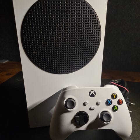 Microsoft Xbox Series S spelkonsol i vit färg. Konsolen är en digital modell utan skivläsare och är avsedd för spel, underhållning och streaming. En trådlös vit handkontroll ingår enligt bilderna. Anslutningar och portar syns på baksidan av enheten, lämplig för användning med moderna tv-apparater och skärmar via HDMI.