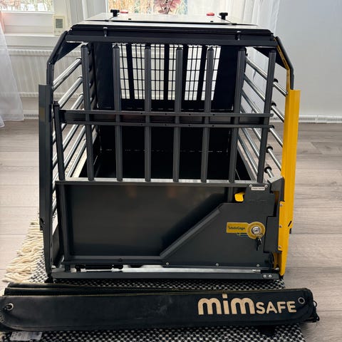 MimSafe VarioCage hundbur i metall. Bur med gallerkonstruktion och låsbar dörr framtill. Anpassad för transport av hund i bil. Stabil ram och ventilerade sidor ger god luftcirkulation. Burens snedställda bak- och framkant är utformade för att passa i bilens bagageutrymme. Lämplig för säker förvaring och transport av hund under bilresa. Fint skick.