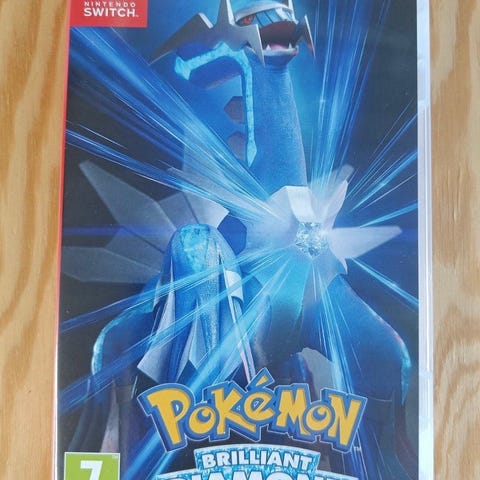 Nintendo Switch Pokémon Brilliant Diamond spel. Fysisk utgåva i plastfodral med spelkassett. Rollspel i Pokémon-serien anpassat för Nintendo Switch-system. Omslag och innehåll visar standardutgåva med PEGI 7-märkning.