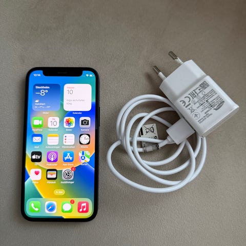 Apple iPhone 12 smartphone med 256 GB intern lagring. Modellen har en blå baksida och pekskärm på framsidan. Lämplig för appar, surf, meddelanden, foto och video samt lagring av filer, bilder och musik.