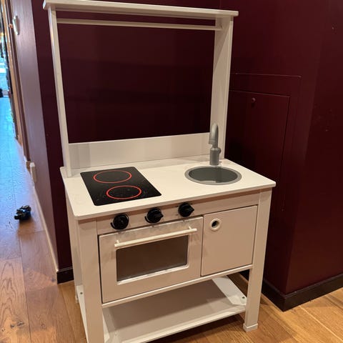 IKEA leksakskök i trä med vita luckor. Köket har diskho, kran, spisplattor och utrymme för förvaring bakom dörrar och i låda. Överskåp med hyllor och en lucka med fönster ger extra förvaringsyta för leksakstallrikar, koppar och andra tillbehör. Passar för inomhuslek i barnrum eller lekhörna.
