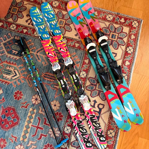 Tecno Pro Rocker alpinskidor med längd 115 cm. Skidorna har en flerfärgad design med grafiskt mönster och är utrustade med integrerade bindningar.