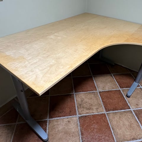 IKEA skrivbord och förvaringsmöbler i trä och en hurts. Skrivbordet är brett 110 cm djupt 81cm höjd 74;5 cm.