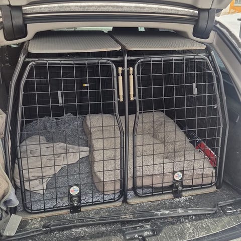Hundbur i metall i svart färg. Burens konstruktion består av metallgaller med ram och förstärkt nederkant. Passar för transport av hund i bil eller som viloplats inomhus. Utformad för att placeras i bagageutrymme eller annan plan yta.