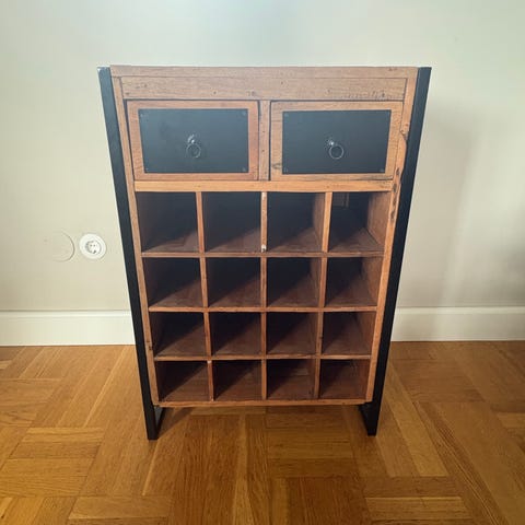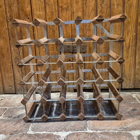 Vinställ i svart metall med plats för 6 flaskor. Stället har bågformad ovandel och dekorativa svängda detaljer i sidor och nederkant. Passar för förvaring av vinflaskor stående på golv eller bänk i kök eller vardagsrum.