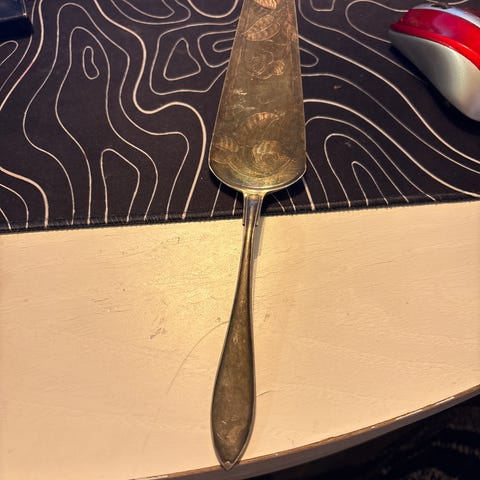 Bergmansro BENS serveringsspade i metall. Spaden har dekorativt mönstrat handtag och är avsedd för servering av exempelvis bakverk eller dessert. Märkt med "Bergmansro" och "BENS" på skaftet. Passar i kök eller matsal som funktionellt serveringsbestick eller som äldre bruksföremål i dukning.Detta är en silverpläterad smörkniv i "Garland" (även känd som "Rapture") mönstret, tillverkad av Rogers Bros runt 1937.