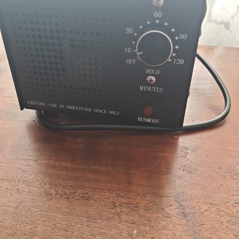 Ozoneair Plus ozongenerator i svart utförande. Bärbar modell med handtag och nätkabel för anslutning till vägguttag. Enheten har digital display, vred för inställning samt knappar för lägen, timer och start/stop. Avsedd för ozonbehandling av utrymmen enligt tillverkarens anvisningar. Tekniska data och säkerhetsinformation finns på märkskylten på undersidan av apparaten.