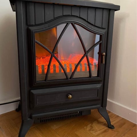 Elektrisk kamin med glasdörrar i svart färg. Kaminen står på ben och har dubbla dörrar med fönsterliknande spröjs samt handtag framtill. Den är avsedd för inomhusbruk och ansluts till vägguttag. Till kaminen hör en fjärrkontroll med knappar för värme, dimmer, timer och justering upp och ned av inställningar. Passar som extra värmekälla och dekorativ inredningsdetalj i vardagsrum eller andra bostadsutrymmen där eluttag finns tillgängligt.