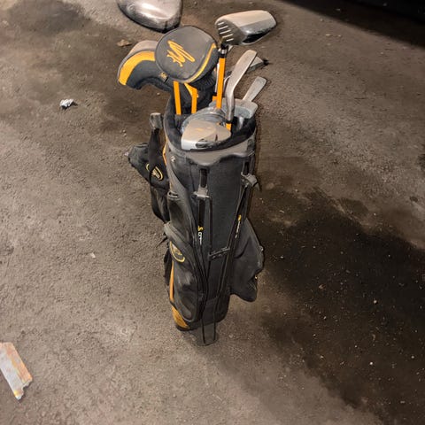 Klubborna har grafitskaft med standardgrepp i bra skick! Bra förvaring i bagen, alla dragkedjor hela!
