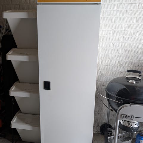 kåpet har dörr med handtag och invändiga upphängningsfästen för kläder och andra textilier.
