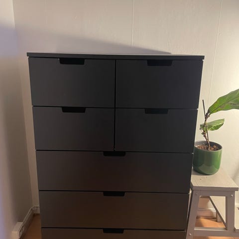 Ikea malm byrå svart. Den är fin framifrån och funkar toppen! Den har några repor på sidan och uppe på, och nagg på lådan - se bilder.