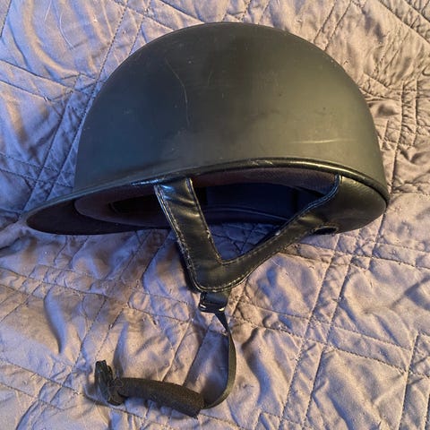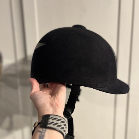 Ridhjälm i storlek L, anpassad för huvudomfång 57–59 cm. Hjälmen är svart med ventilerande partier och justerbart hakband. Invändigt finns ett foder med Coolmax-tyg för bättre fukttransport och komfort.