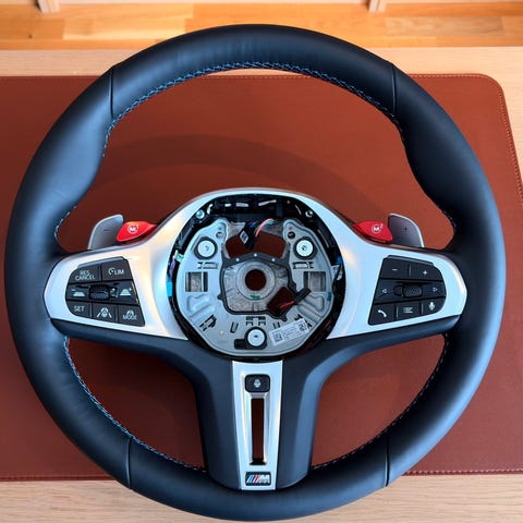 BMW ratt med multifunktion. Ratten är utrustad med knappar för styrning av funktioner som exempelvis ljud och telefon.