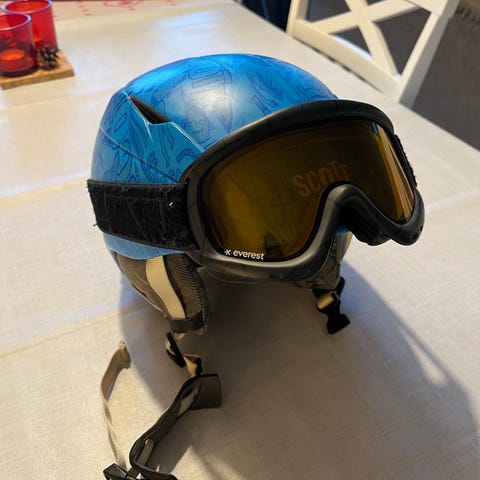 Picture skid- och snowboardhjälm i svart färg tillsammans med ett par skidglasögon i orange med rödtonad lins. Hjälmen har justerbart spänne i nacken och fäste för glasögonrem på baksidan. Skidglasögonen levereras med förvaringspåse. Utrustningen är avsedd för alpin skidåkning eller snowboardåkning.