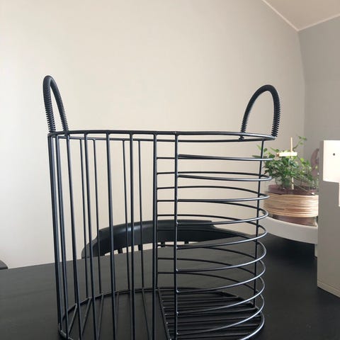 Stor svart metallkorg med handtag. Diameter upptill på 40cm och 52cm hög.