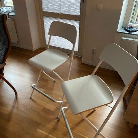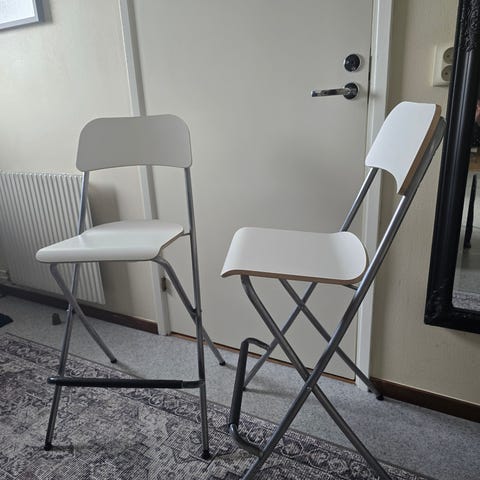 Två vita barstolar som kan fällas ihop. Pris kan diskuteras vid smidig affär