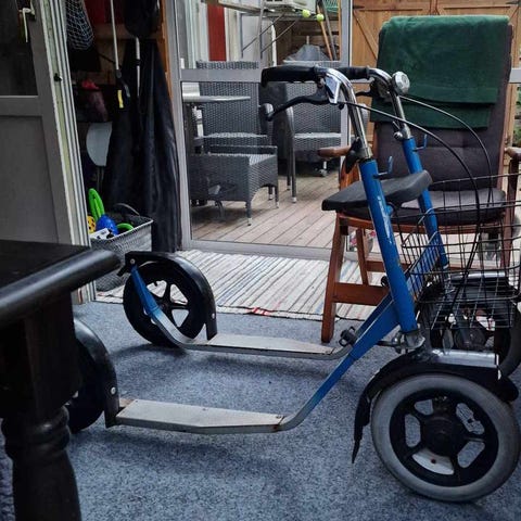 Monark sparkcykel i trehjulig modell. Kraftig ram i metall med två fotplattor fram och ett större hjul bak. Färg grå med svart Monark-logotyp på ramen. Utrustad med stora hjul för stabilitet och användning på hårda underlag. Lämplig som sparkcykel för vuxna eller äldre barn beroende på längd och viktgräns från tillverkaren.
