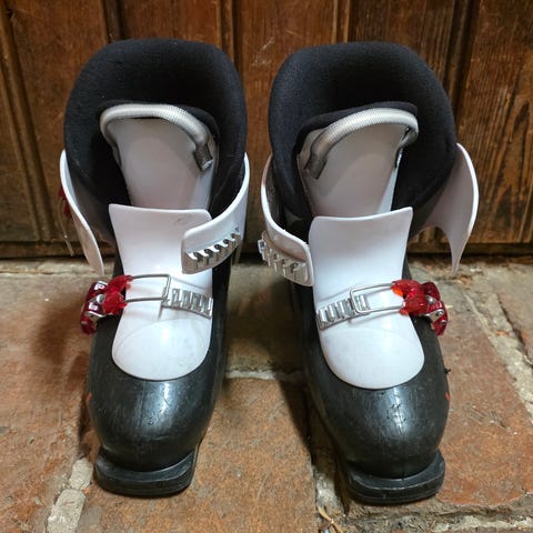 Skidpjäxor i svart, vit och röd färg. Modellen har hårt ytterskal med flera spännen framtill för att kunna justera passformen runt fot och underben. Insidan är försedd med vadderad innersko för ökad komfort och stöd. Lämpliga för alpin skidåkning i pistsystem där vanliga alpina bindningar används.
