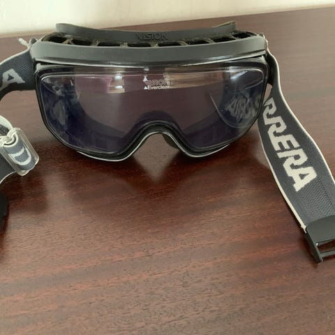 Storleken framgår av linjalen på bilden. Elastiskt band gör att glasögonen kan användas tillsammans med hjälm.