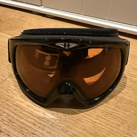 Carrera skidglasögon med svart ram och svart justerbart band med Carrera-logga. Glasögonen har brun tonad lins som lämpar sig för skidåkning och andra vintersporter.