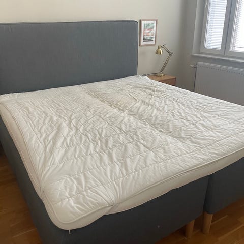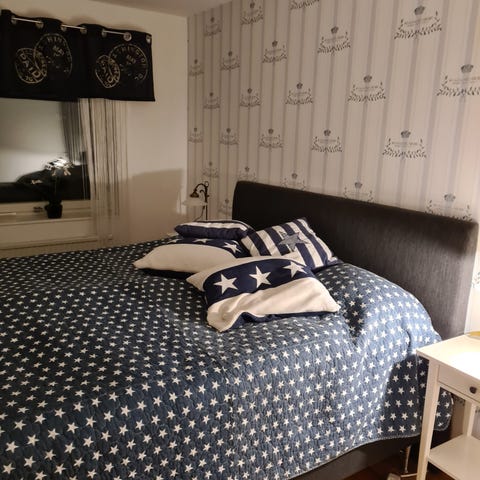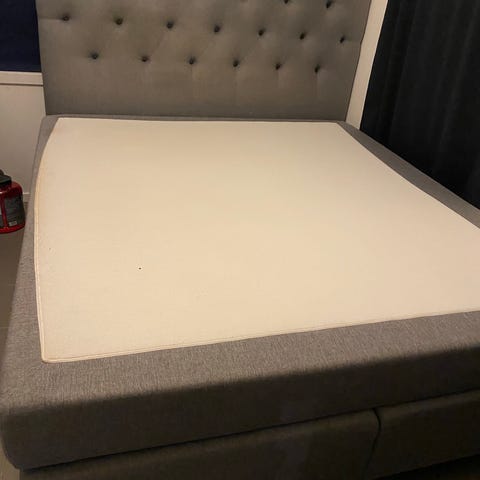 Ikea säng med stoppad huvudgavel i grått tyg. Sängen har en hög, knapptad gavel matchande grå klädsel. Passar som vuxensäng i sovrum eller gästrum. Måttet är