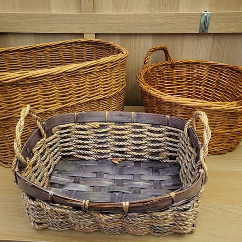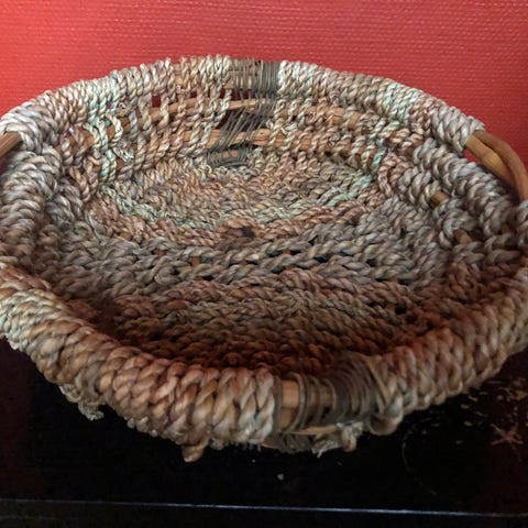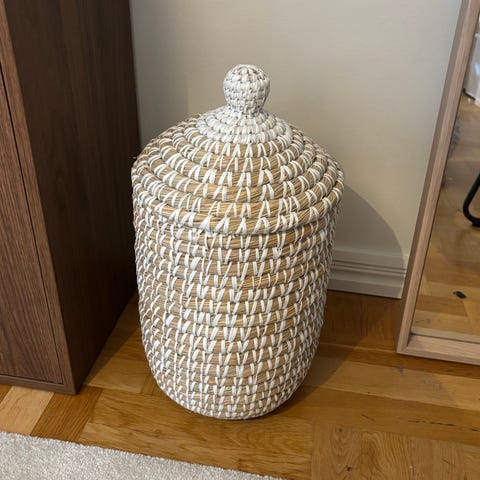 Underbart fin korg i flätat material. Perfekt för att förvara filtar eller kuddar i sovrummet eller vardagsrummet. Väldigt gott skick! Stått i ett gästrum. 🤍