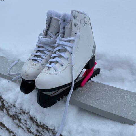 Nancy skridskor i storlek 35. Klassisk vit modell med snörning och hög ankelkappa för stöd. Blad i metall med tåtagg fram.