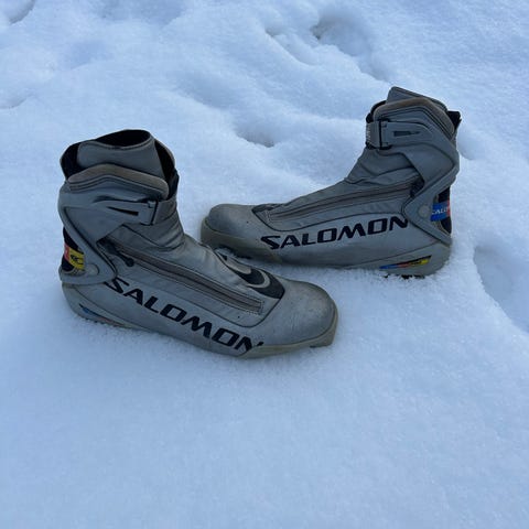 Salomon längdpjäxor i vit och blå färg med svarta detaljer. Det är pjäxor avsedd föe klassiska stil. Storlek 36⅔