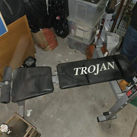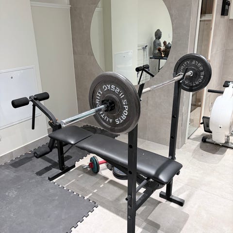 Abilica träningsbänk med skivstångsställning i svart och röd färg. Bänken har vadderad sits och ryggstöd samt benstöd med skumrullar för benövningar. Ställning för skivstång är integrerad med bänken. Passar för styrketräning i hemmagym, till exempel bänkpress, situps, benpress och olika hantelövningar.