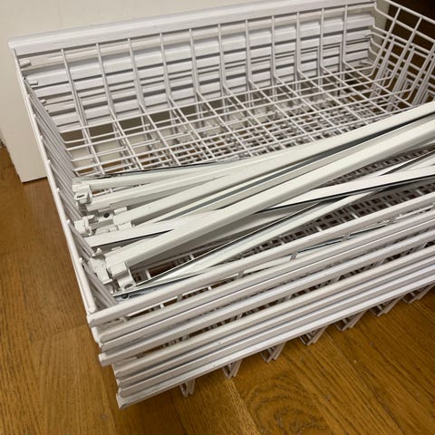 Elfa förvaringssystem med flera sektioner av trådkorgar i vitlackerad metall. Systemet består av höga gavlar och utdragbara trådkorgar i flera nivåer. Bredden på en sektion är cirka 50 cm enligt måttbandet på bilden. Passar för förvaring av kläder, textilier eller andra hushållsartiklar i exempelvis garderob, förråd eller tvättstuga. Design av Achille Castiglioni enligt angiven uppgift.