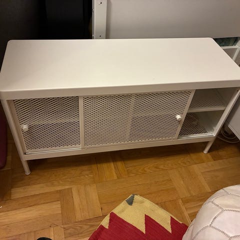 Ett TV-skåp i metall skapat av danske formgivaren Nicholas Wiig Hansen, PS-skåp. Rymligt med en hylla och låsbara dörrar.