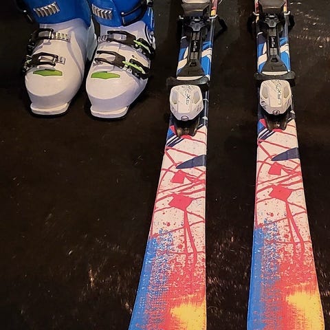 Alpinskidor med bindningar och tillhörande pjäxor. 2 st set med skidor, stavar och pjäxor för barn och ett par skidor med stavar för vuxen. Justerbara bindningar. Passar för utförsåkning i pist.