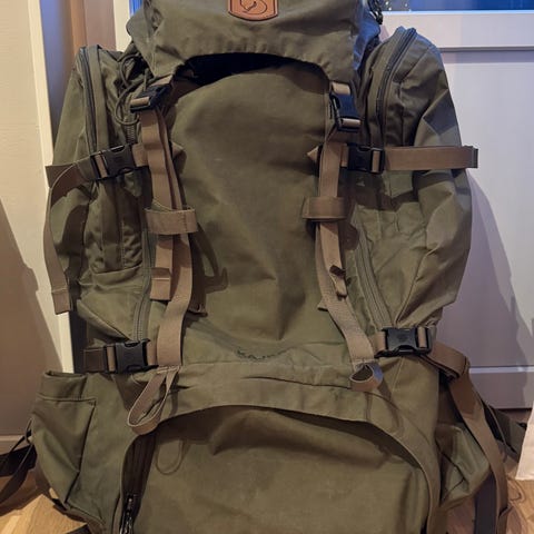 Fjällmarkvandringsryggsäck i grön färg med DCS (Dynamic Carry System) bärsystem. Ryggsäcken har vadderade och justerbara axelremmar, bröstrem och höftbälte för bättre viktfördelning. Toppmatat huvudfack med dragsko och lock, samt flera kompressionsremmar på sidorna. Medföljande svart regnskydd med Fjällräven-logotyp ingår. Lämplig för vandring och längre turer där större packvolym behövs.
