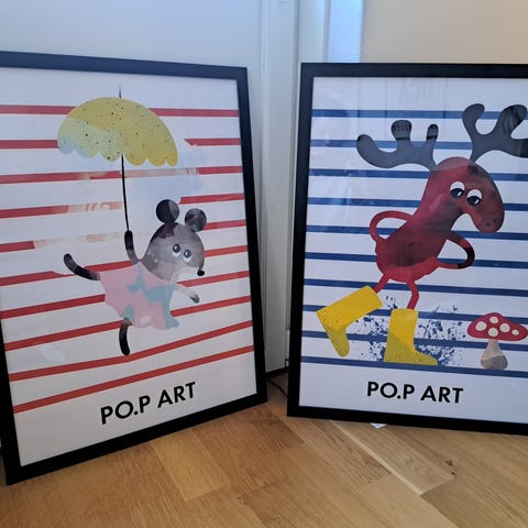 Mrs Mighetto barnposters med motiv av illustrerade figurer, inramade i träramar. Passar som väggdekoration i barnrum eller lekrum. Neutrala, dova färger som gör dem enkla att kombinera med annan inredning.