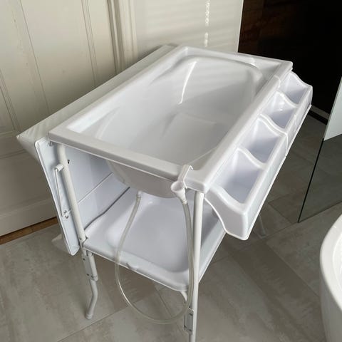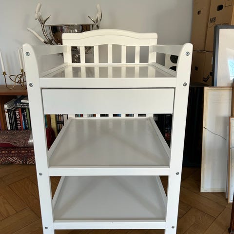 Jollyroom skötbord med badbalja i vit färg. Skötbordet har överdel med integrerad badbalja och avtappningsslang. Underdelen består av två hyllplan för förvaring av blöjor, handdukar och andra tillbehör. Utrustat med hjul för enkel förflyttning. Passar för skötsel och bad av spädbarn och småbarn i hemmet.