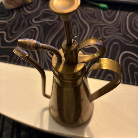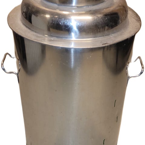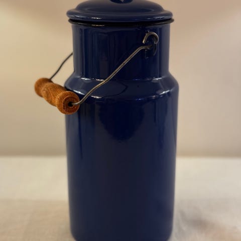 Charmig mjölkkanna från Tierp, Uppsala. Trähöljet är tidsenliga, men dock aningen stor för aktuell flaska.