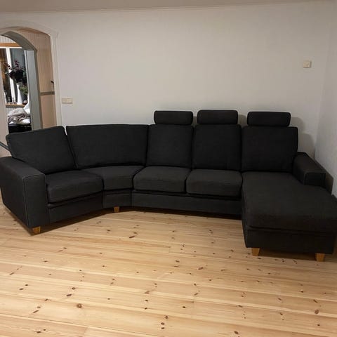 Mio soffa med divan i grått tyg tillsammans med matchande fåtölj och fotpall. Soffan har flera sittplatser med lösa rygg- och sittkuddar samt en divandel för utsträckt sitt- eller liggposition. Fåtöljen har hög rygg och medföljande kudde, och fotpallen är klädd i samma grå tyg. Klädseln är i vävt tyg och möblerna står på ben i trä. Passar som sittgrupp i vardagsrum eller liknande utrymme. Först till kvarn och högst bjudande