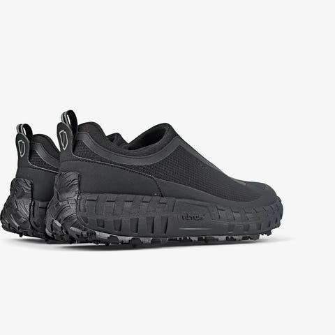 This laceless approach shoe utilizing a customized Vibram® midsole and soleplate as its foundation allows for long days on feet with uncompromising traction. A Bio-Dyneema® upper with an added elasticized Bio-Dyneema® allows for a fit that remains unchanged over time. Between a padded heel collar and reversed heel tab is a pull tab through which the shoes can easily be clipped to a pack.