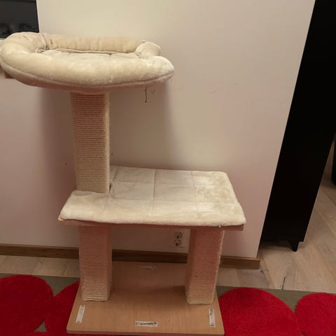 Kattställning klösträd i flera nivåer i grå och beige färg. Klöspelarna är lindade med sisal för klösning och lek. Konstruktionen har flera ligg- och klätterplan, en hängmatta, en rund bädd högst upp samt en klöslåda/gömställe med öppning. Ytorna är klädda i mjuk plysch för bekväm vila för katten. Passar för inomhusbruk.
