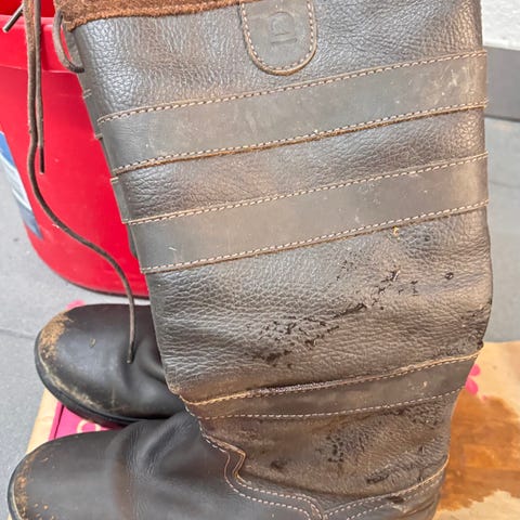 Dubarry stövlar i brun läder med grov yttersula. Storlek EU 38 (UK 5). Insidan har textilfoder med rutigt mönster. Modellen är märkt Regular i vidden. Stövlarna är höga och lämpar sig för användning utomhus i varierande väderförhållanden.